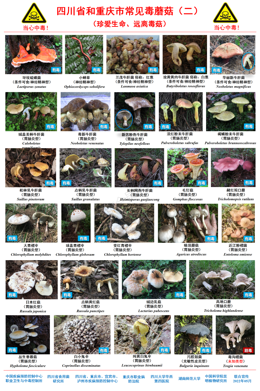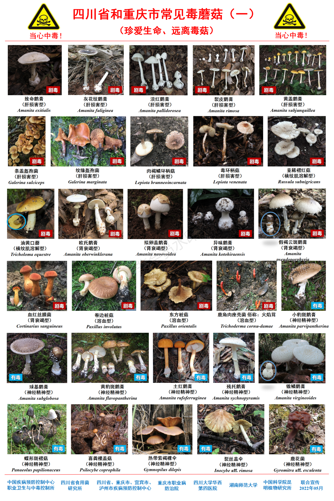 我省有不少山区丘陵地带,每当6-8月进入夏季,雨水增多,野生蘑菇便进入生长旺季。人们为尝鲜或是猎奇常常自己去树林里采摘,成为中毒事件的一大隐患。野生蘑菇种类繁多,大家经常是凭经验采摘或购买,于是乎中毒事件经常发生。为了提高大家的识别能力, 我们帮大家汇总了最新川渝地区常见毒蘑菇: